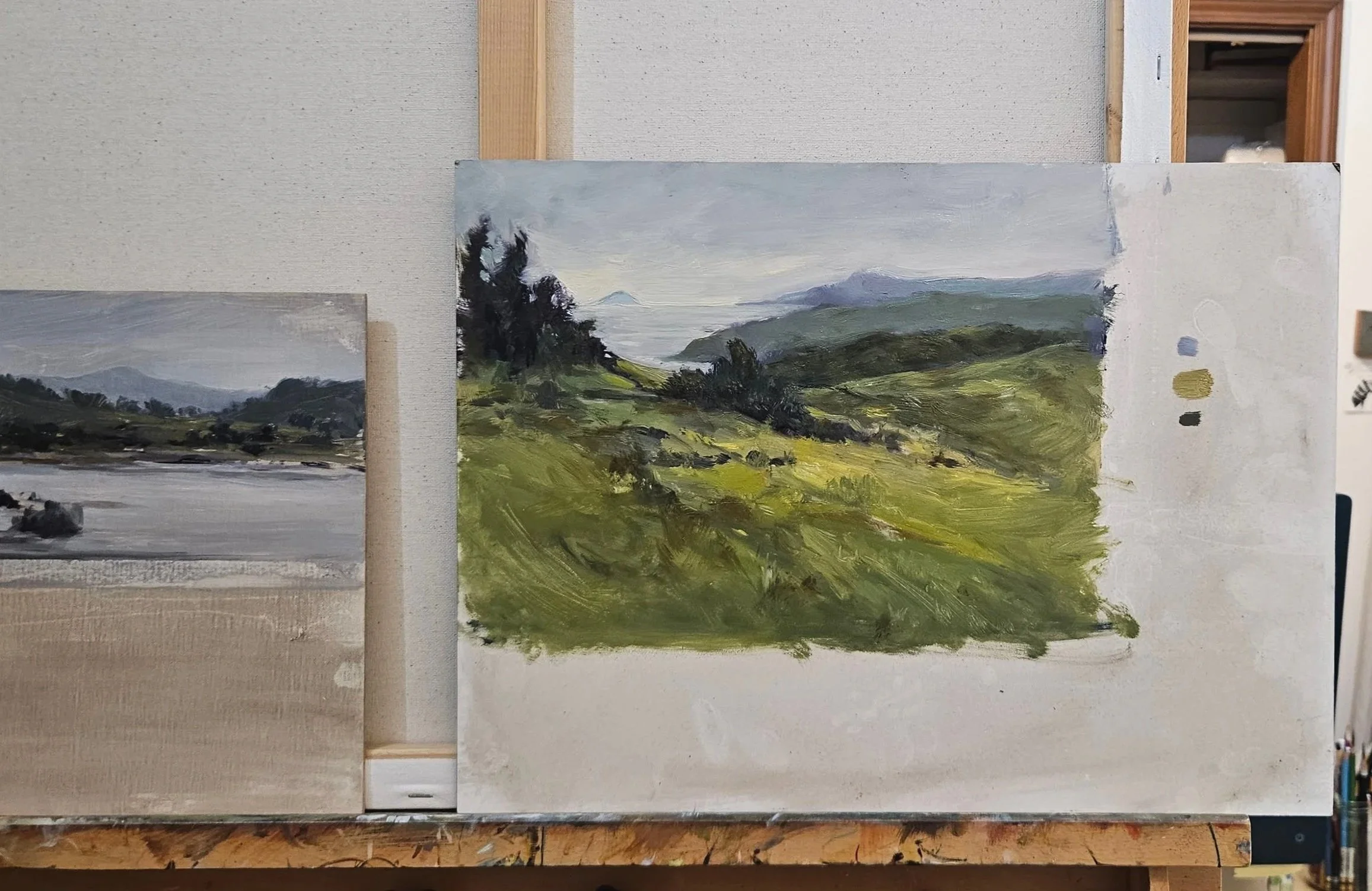 This was a study in moving landmarks to make the composition work for me. It was a gorgeous July day in Scotland - the sun was shining over the Isle of Bute. The water was so calm in this inlet - swimming did cross my mind.
