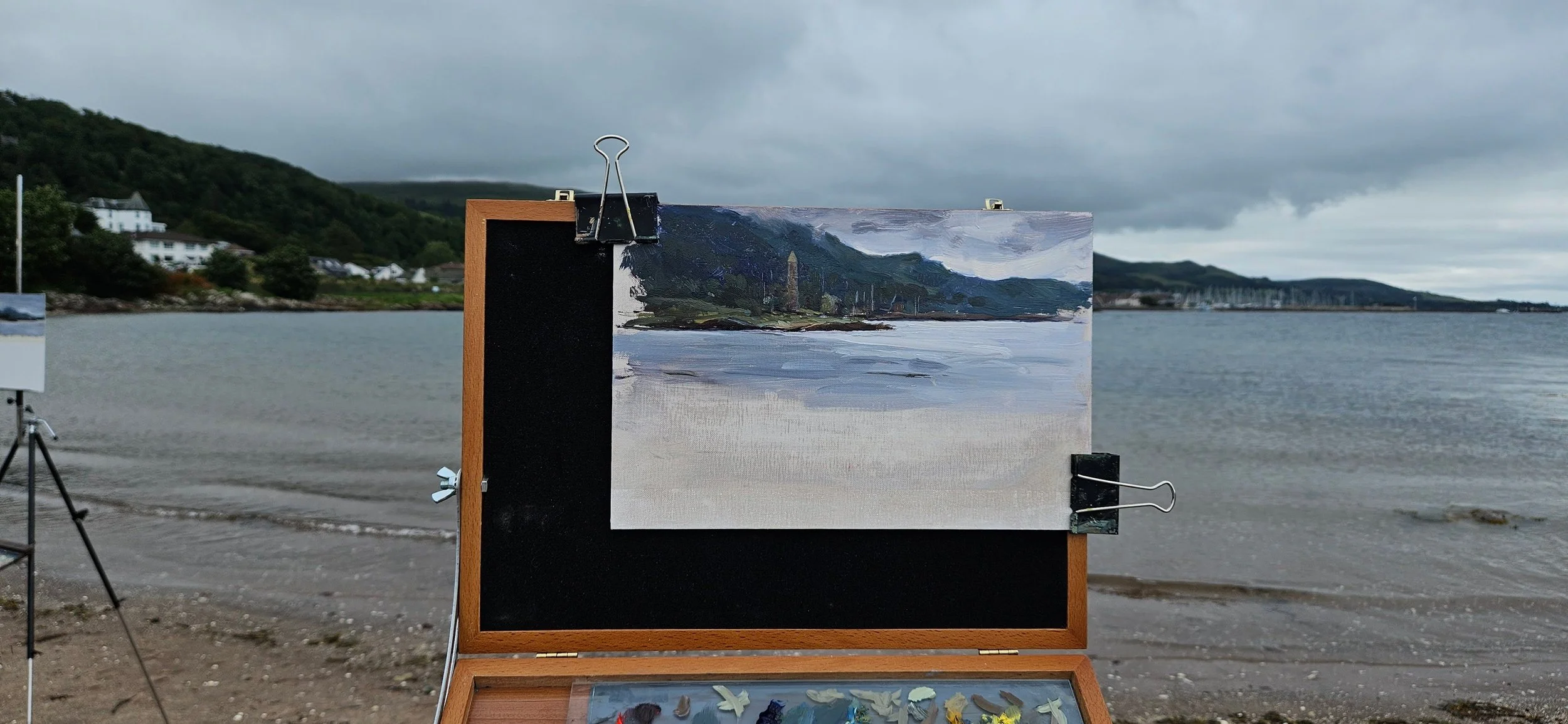 painting in lightly spitting rain on the wet sand of Largs was surprisingly serene. The clouds hung low and touched the hills behind the famous pencil monument. It took just a gentle flick of tinted titanium white to express this moody bit of cloud drifting above the marina.